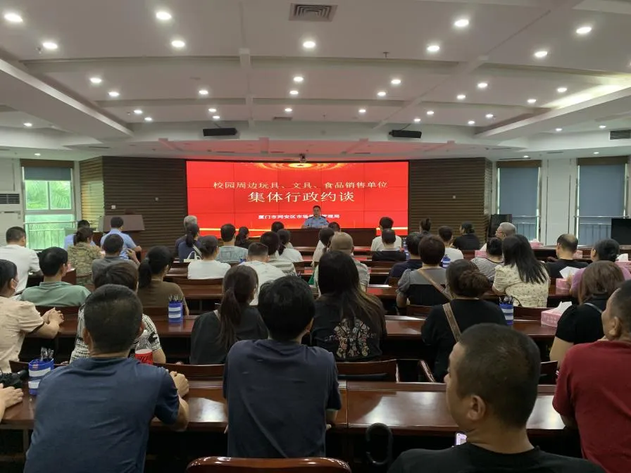 同安區市場監管部門開展校園周邊文具、玩具、食品銷售單位首輪約談,共有65家銷售單位參加了約談,并現場簽訂承諾書。