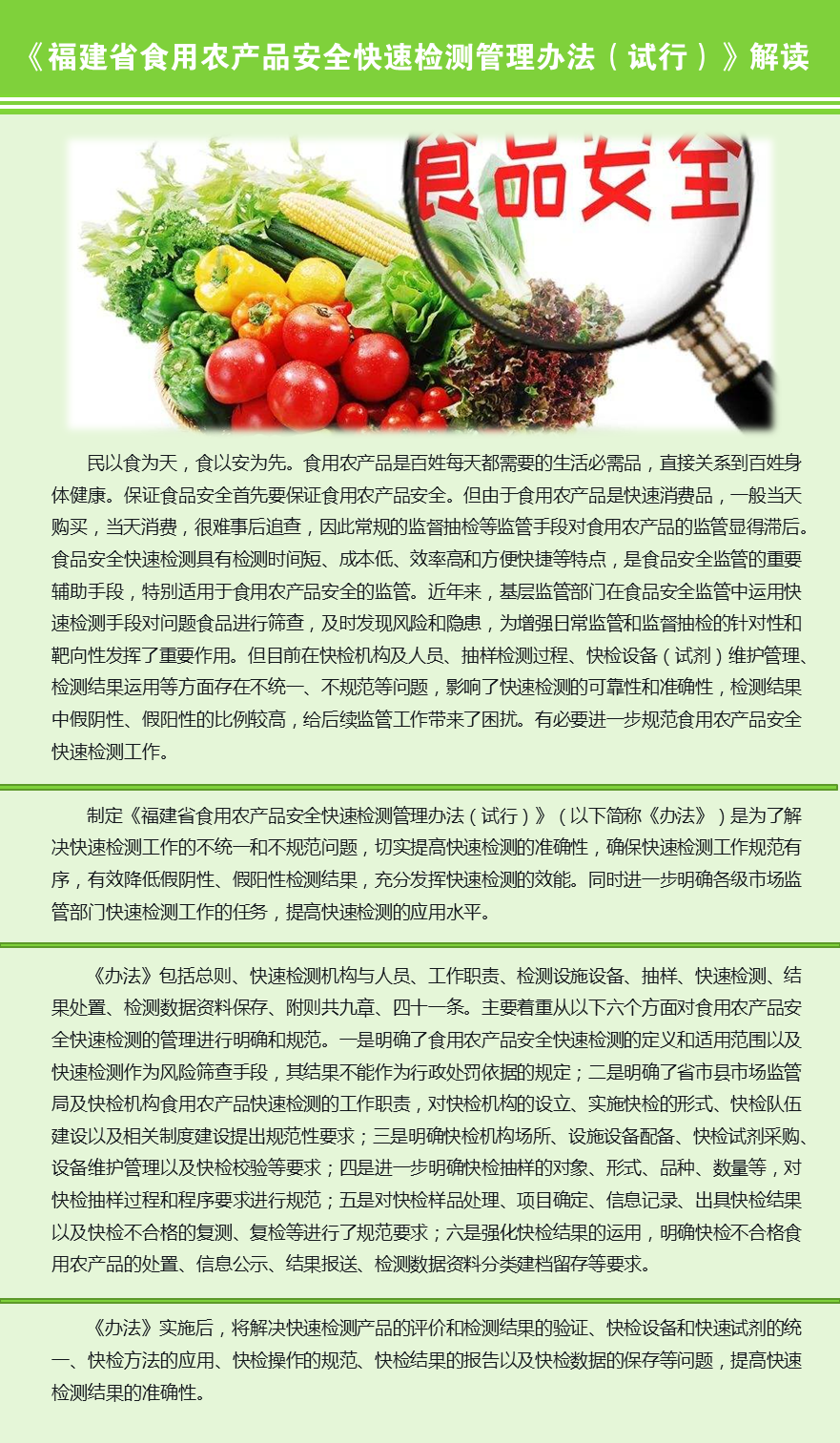 相關文件:福建省市場監督管理局關于印發《福建省食用農產品安全快速檢測管理辦法(試行)》的通知