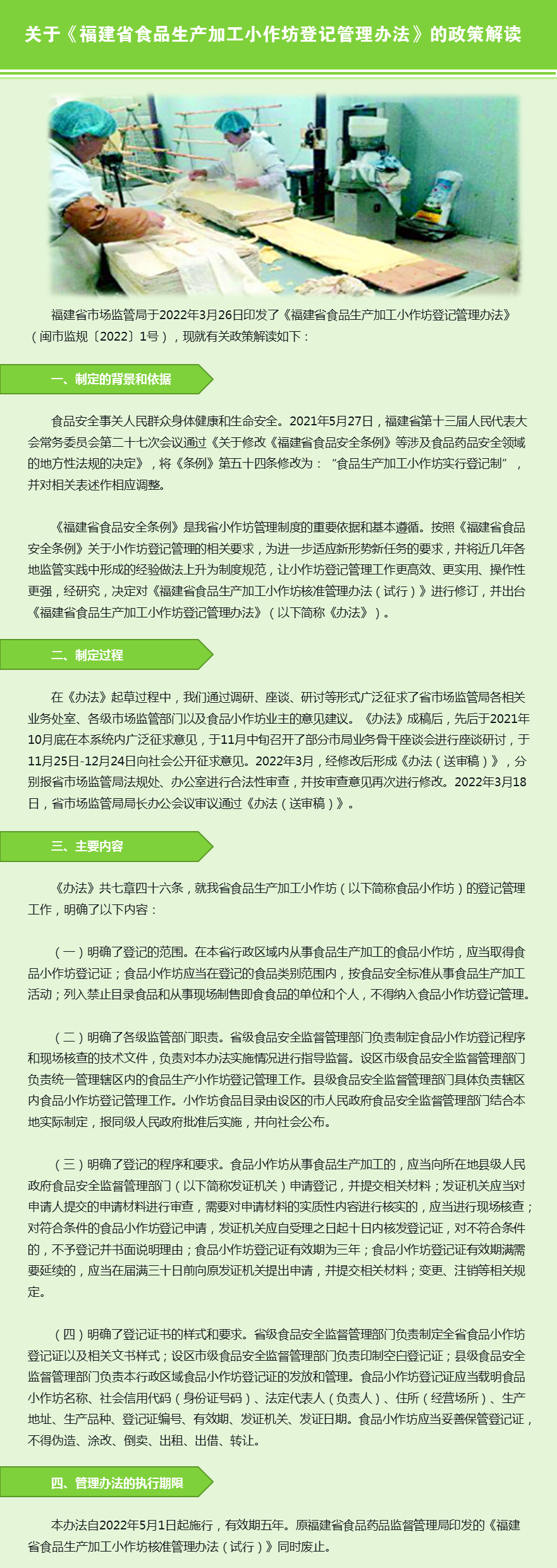 福建省市場監(jiān)管局于2022年3月26日印發(fā)了《福建省食品生產(chǎn)加工小作坊登記管理辦法》(閩市監(jiān)規(guī)〔2022〕1號),現(xiàn)就有關(guān)政策解讀如下: