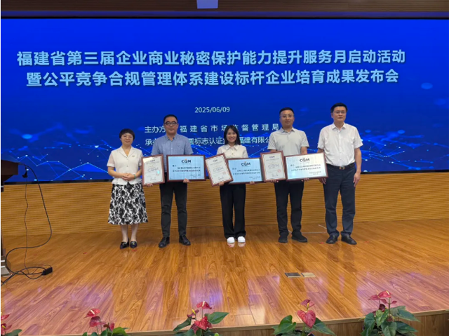 會上,省市場監(jiān)管局反壟斷處負責人發(fā)布福建省商業(yè)秘密保護及公平競爭合規(guī)管理體系建設性成果。福建省以“政策引導為綱、專業(yè)服務為橋、試點先行為本”的培育模式,成功培育出首批三家標桿企業(yè):福建天辰耀隆新材料有限公司、廈門松霖科技股份有限公司、漳州片仔癀藥業(yè)股份有限公司。王文生為三家企業(yè)授予“公平競爭合規(guī)管理體系建設標桿企業(yè)”牌匾,并頒發(fā)合規(guī)管理體系認證證書。