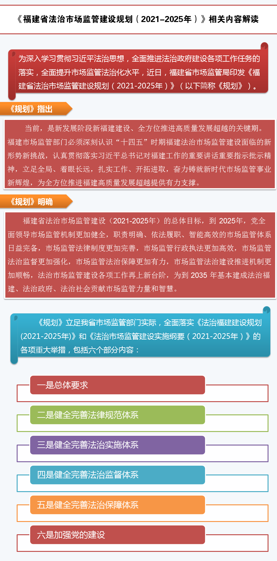 答:立足我省市場監管部門實際,全面落實《法治福建建設規劃(2021-2025年)》和《法治市場監管建設實施綱要(2021-2025年)》的各項重大舉措,包括六個部分24項內容。