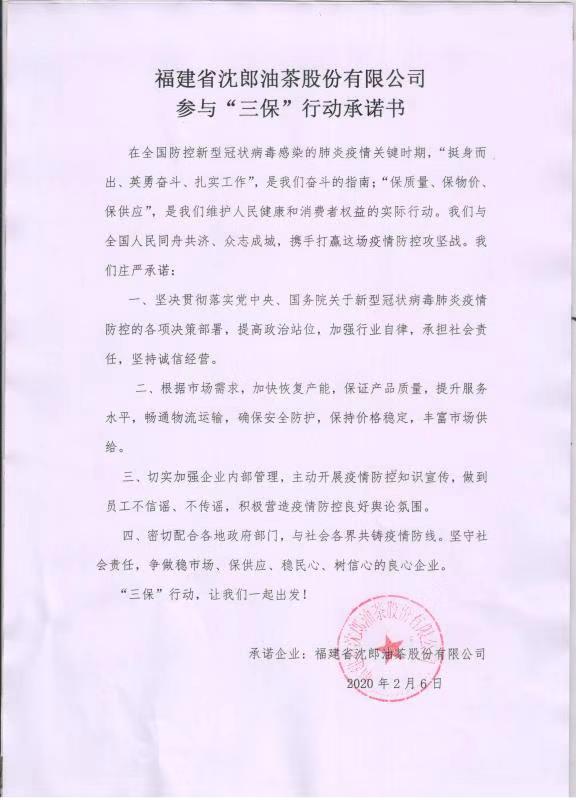 福建省沈郎茶油股份有限公司參與“三保”行動承諾書