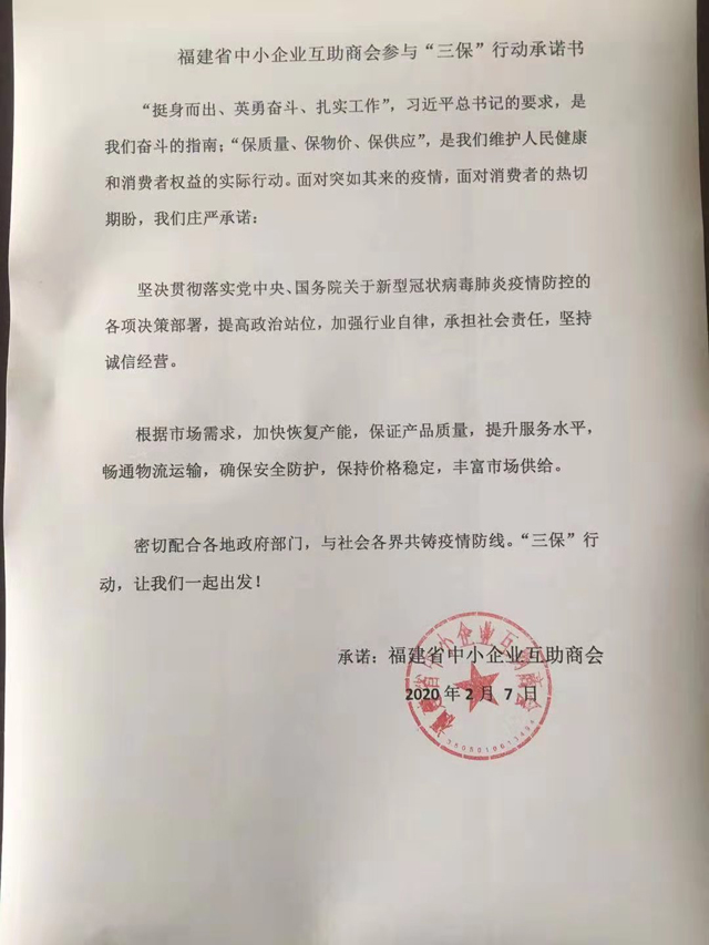 福建省中小企業(yè)互助商會(huì)參與“三保”行動(dòng)承諾書(shū)
