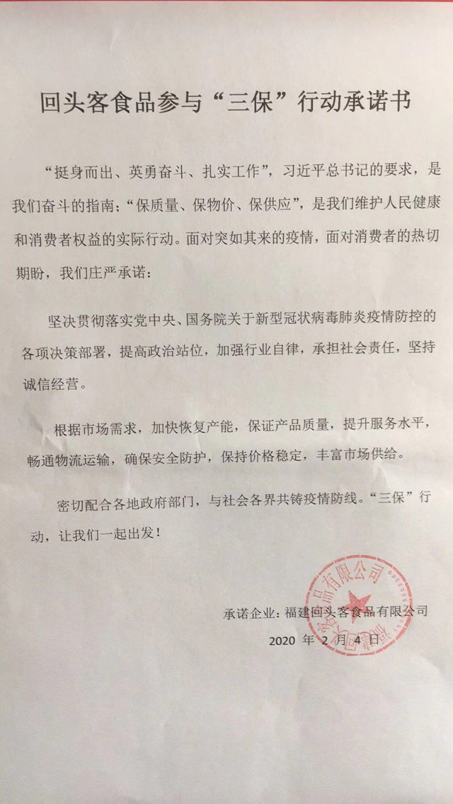 回頭客食品參與“三保”行動承諾書