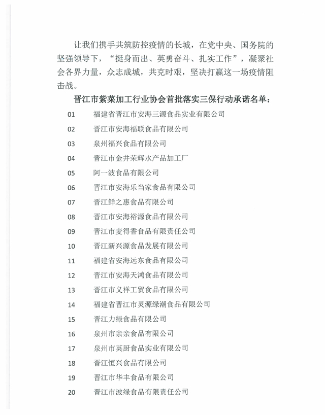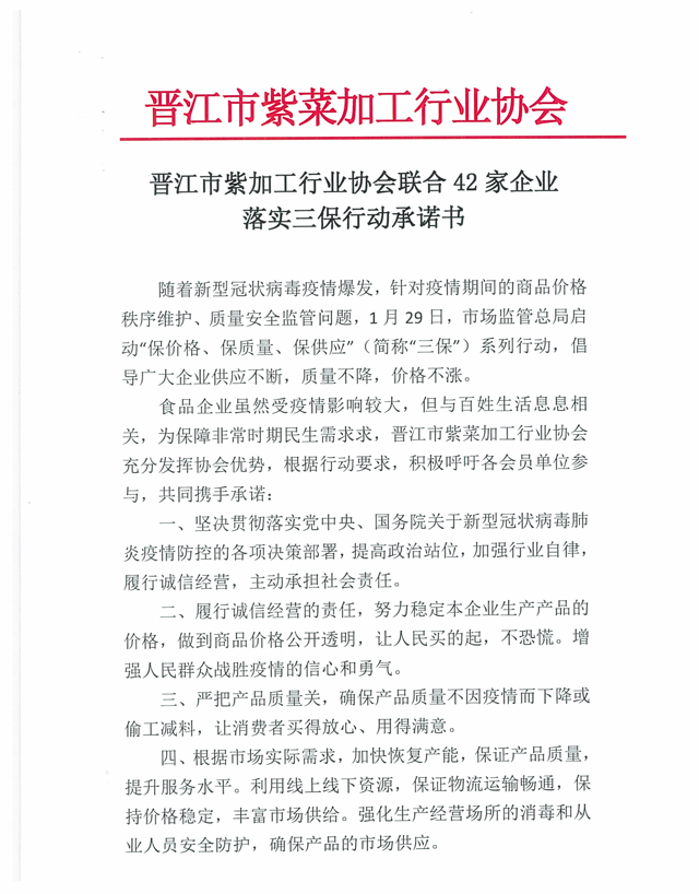 晉江市紫菜加工行業協會聯合42家企業落實三保行動承諾書