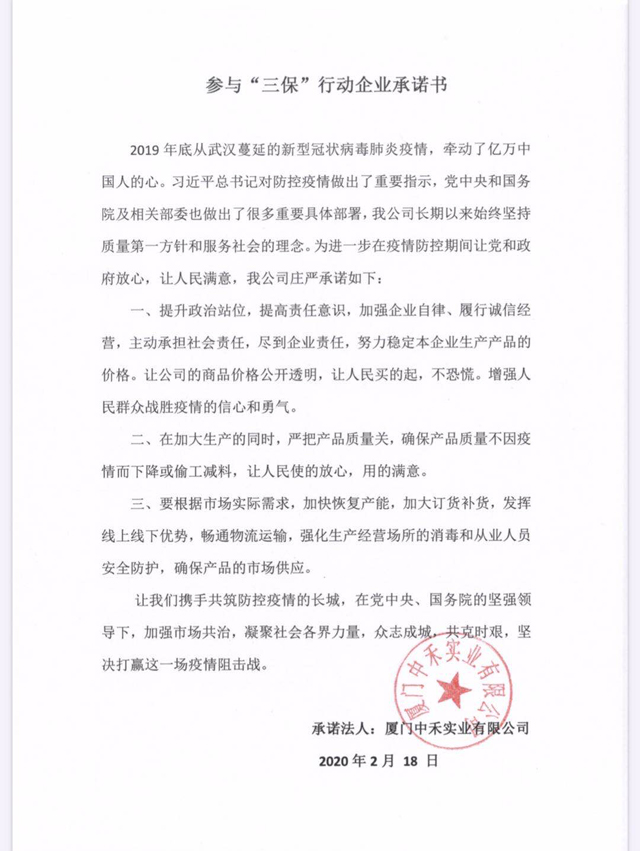 廈門中禾實業(yè)有限公司參與“三保”行動企業(yè)承諾書