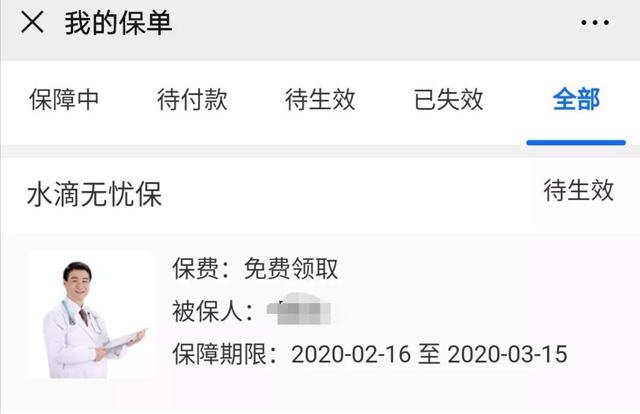 領取成功后,您可以搜索關注微信公眾號“水滴保險”,點擊菜單欄“我的保單”,就可以看到屬于您的免費20萬新冠肺炎保障,之后也不會自動扣任何費用,還請您放心。