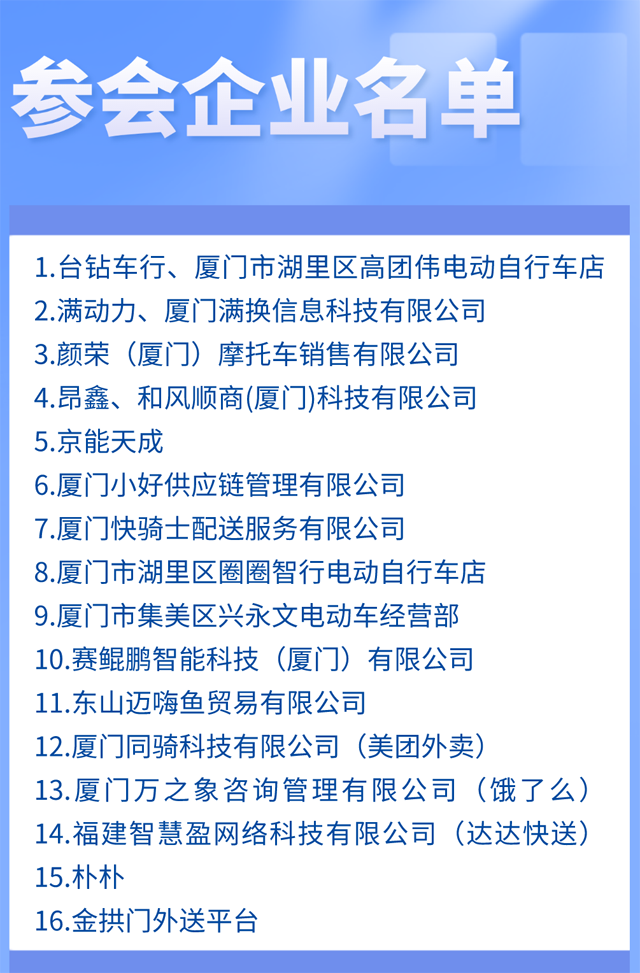 廈門市局鐘向陽總工程師、有關處室負責人、電動自行車規(guī)范管理專班有關人員以及16家電動自行車租賃企業(yè)負責人參會。