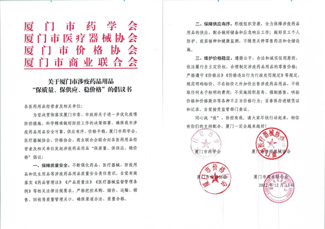 12月13日,在廈門市市場監督管理局指導下,廈門市藥學會、醫療器械協會、價格協會、商業聯合會等相關行業協會聯合發起倡議,號召全市各醫藥用品經營者及相關單位共同向社會做出涉疫醫療藥品用品“保質量、保供應、穩價格”承諾。