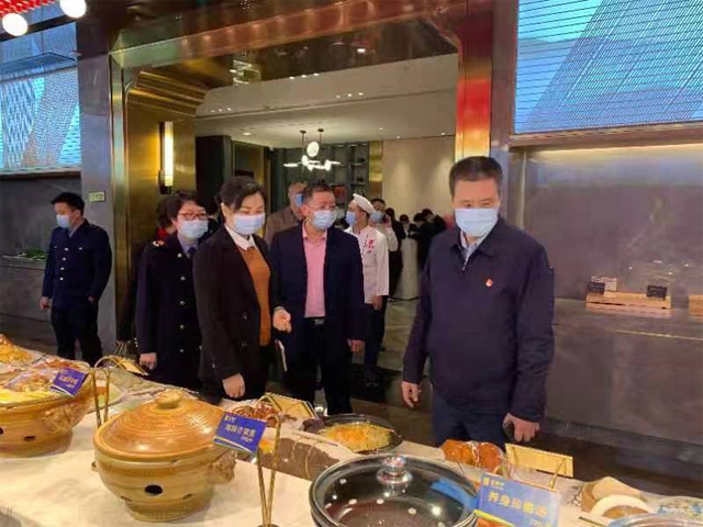 檢查組一行先后前往東街口聚春園大酒店、富黎華海鮮大酒樓(正大廣場店),對餐飲服務單位的后廚衛生、食品留樣、從業人員佩戴口罩等情況進行檢查。