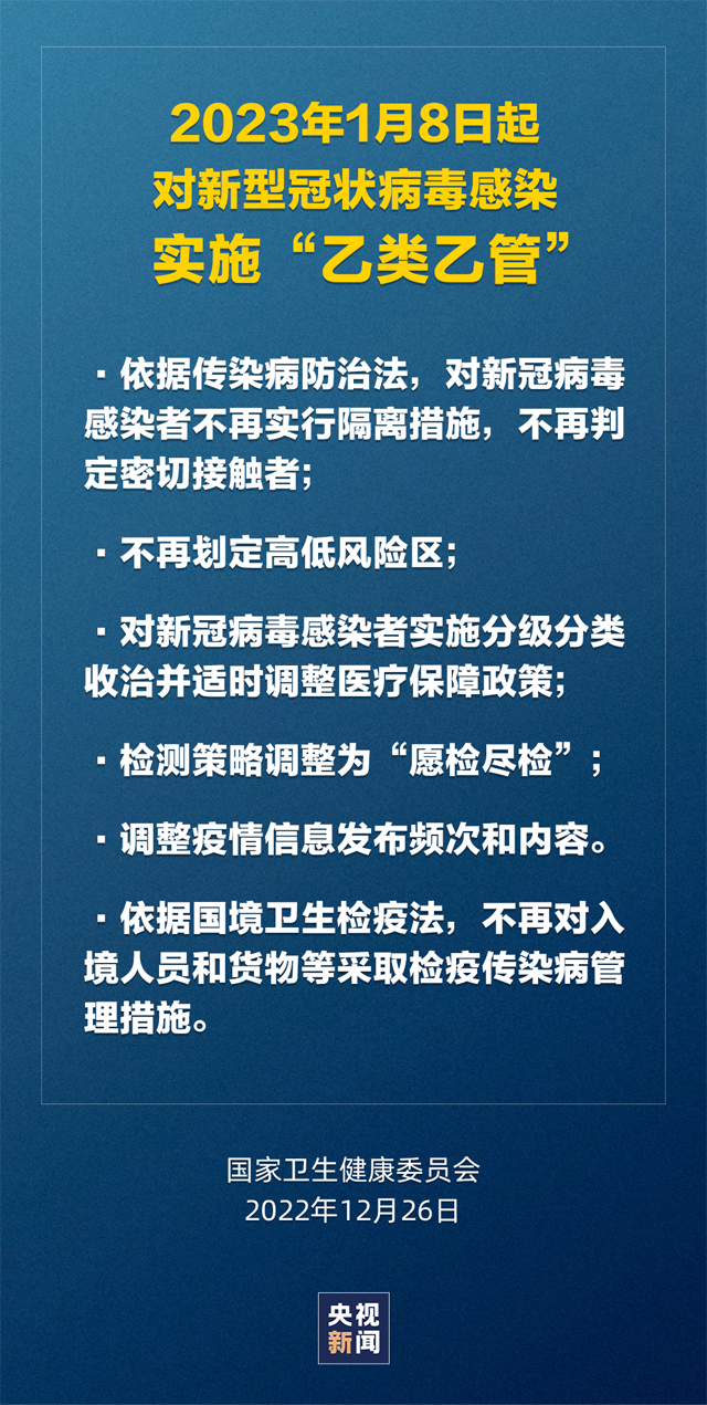 12月26日,國家衛生健康委員會辦公廳印發《關于對新型冠狀病毒感染實施“乙類乙管”的總體方案》,簡版來了↓