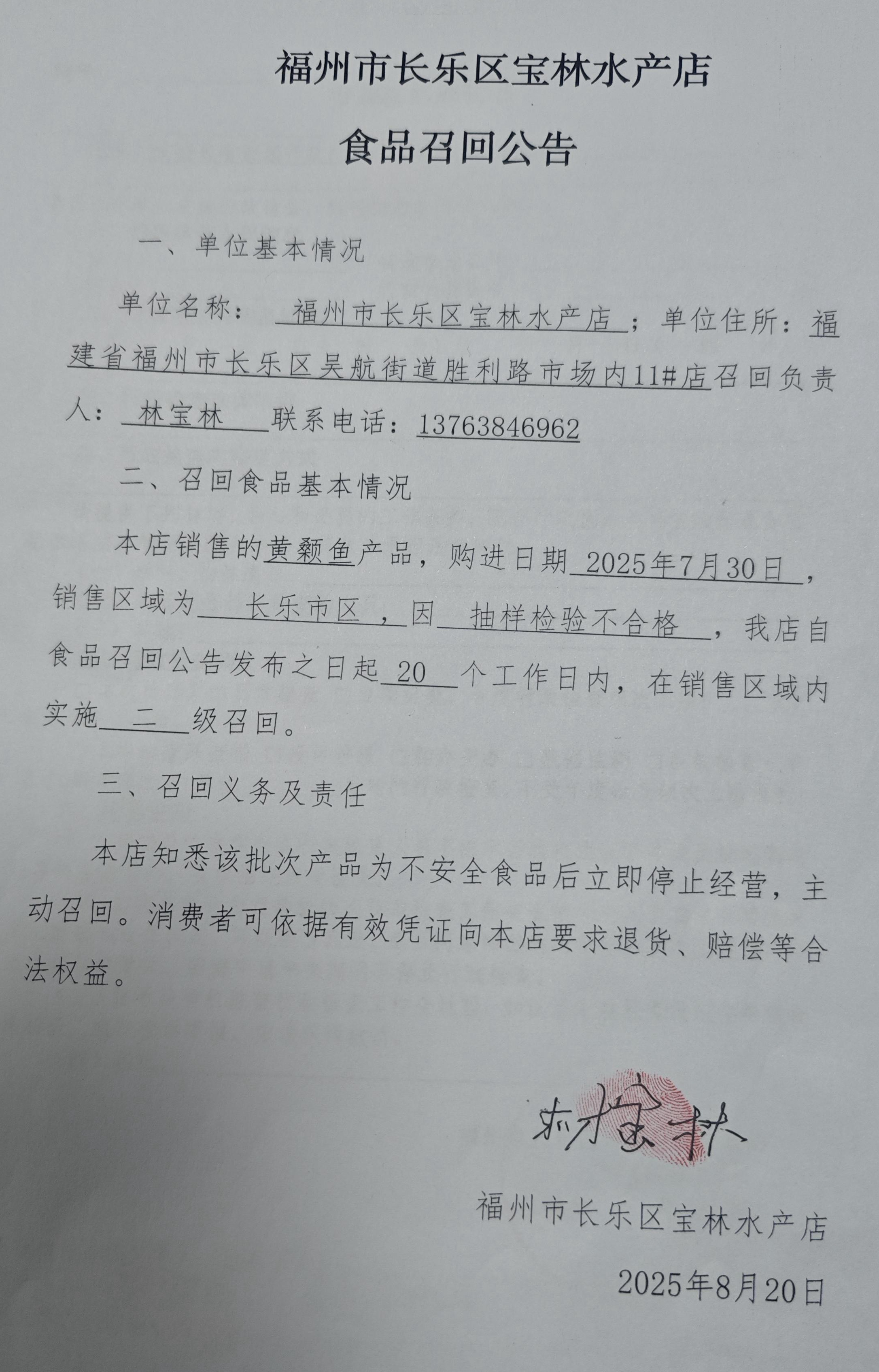 福州市長(zhǎng)樂區(qū)寶林水產(chǎn)店食品召回公告(20250820)