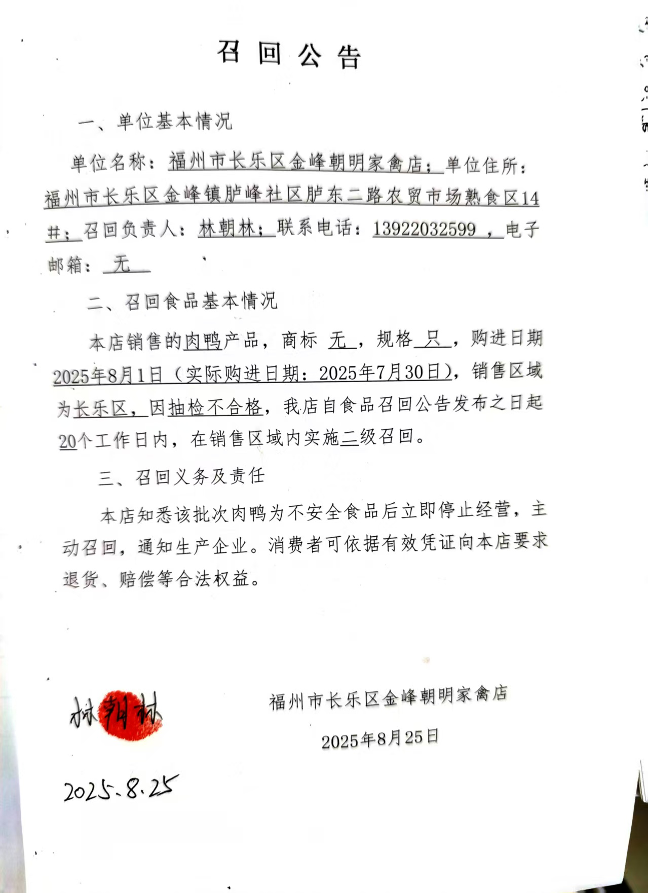 福州市長樂區金峰朝明家禽店食品召回公告(20250825)