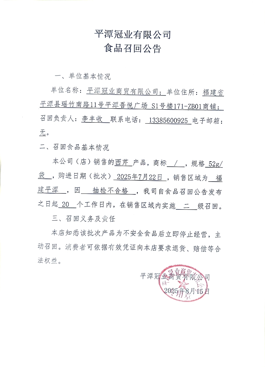 平潭冠業商貿有限公司食品召回公告(20250815)