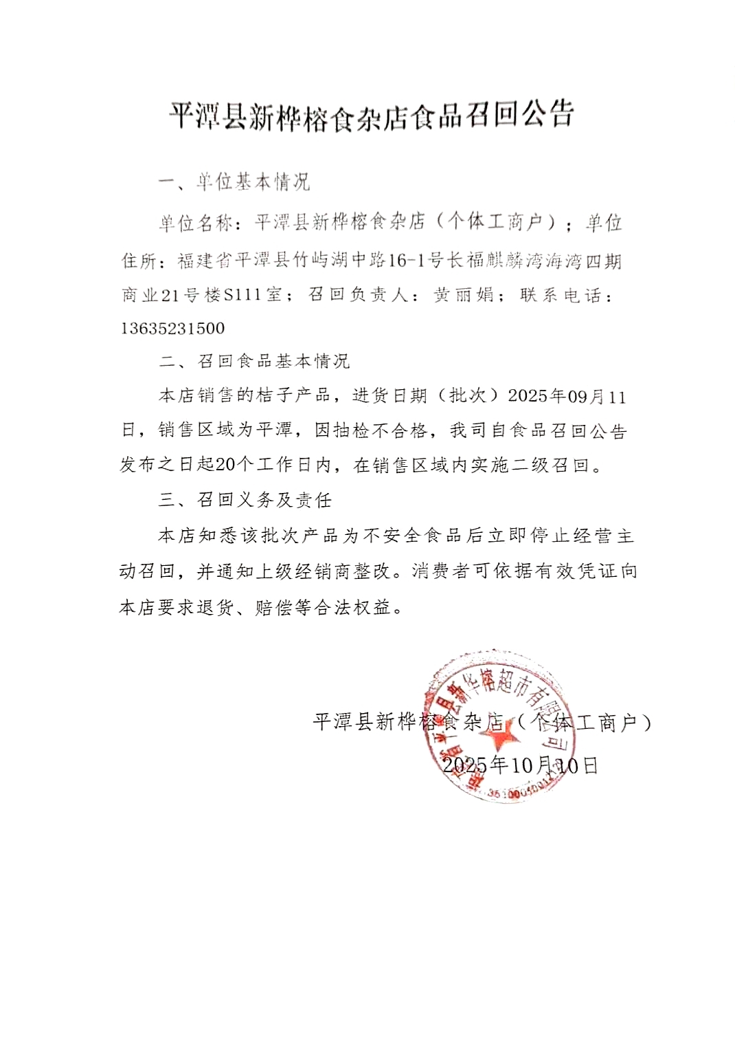 平潭新樺榕食雜店食品召回公告(20251010)