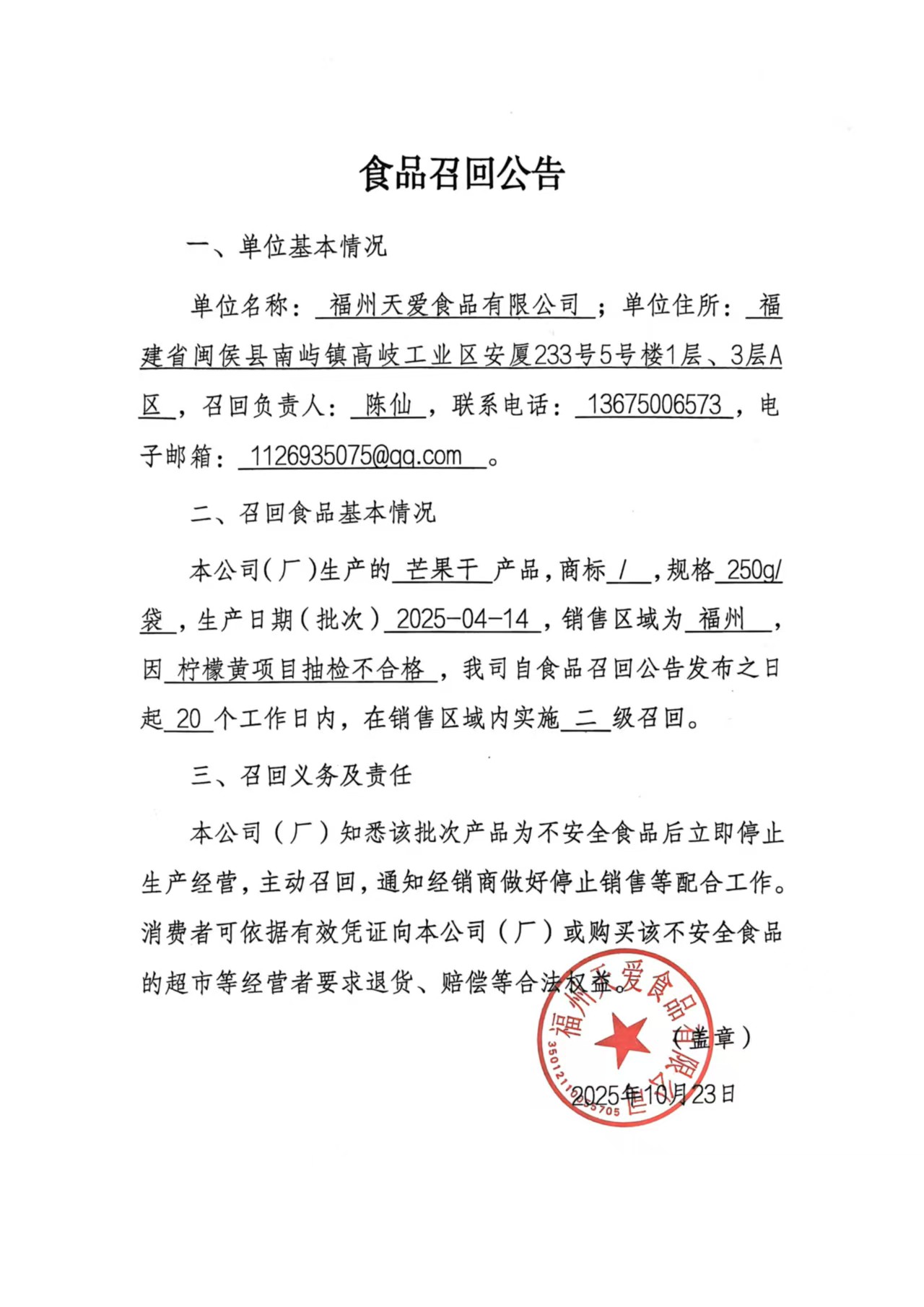 福州天愛食品有限公司食品召回公告(20251023)