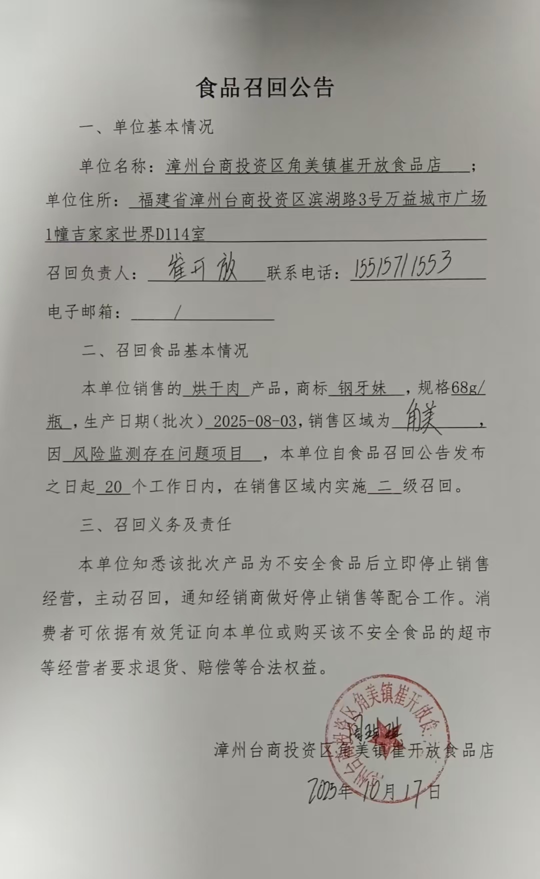 漳州臺商投資區角美鎮崔開放食品店食品召回公告(烘干肉)(20251017)
