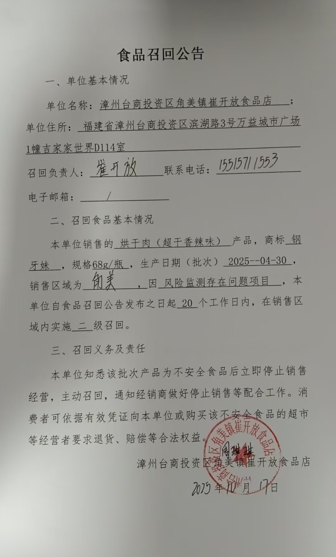 漳州臺(tái)商投資區(qū)角美鎮(zhèn)崔開放食品店食品召回公告(烘干肉超干香辣味)(20251017)