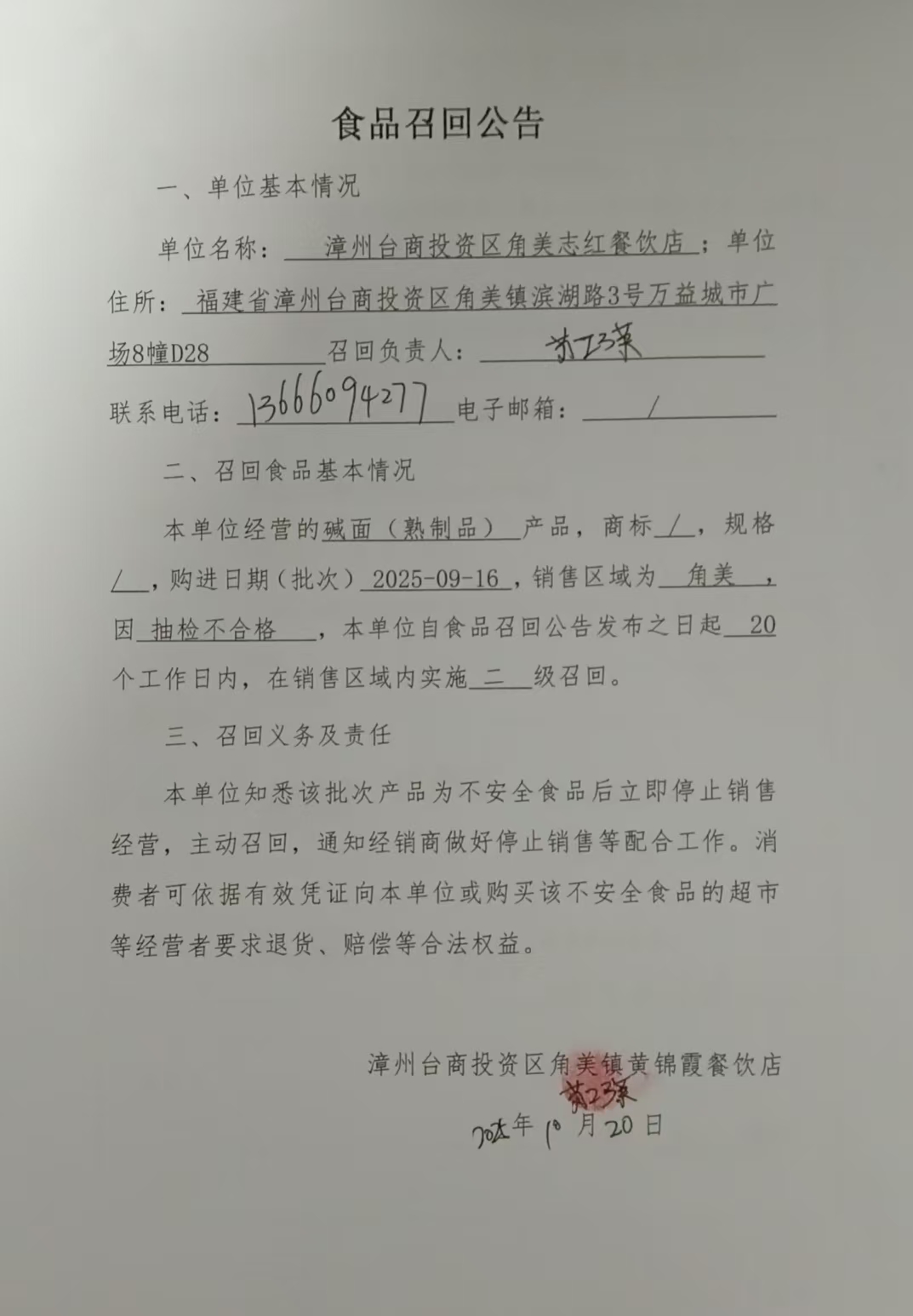 漳州臺商投資區(qū)角美志紅餐飲店食品召回公告(20251020)