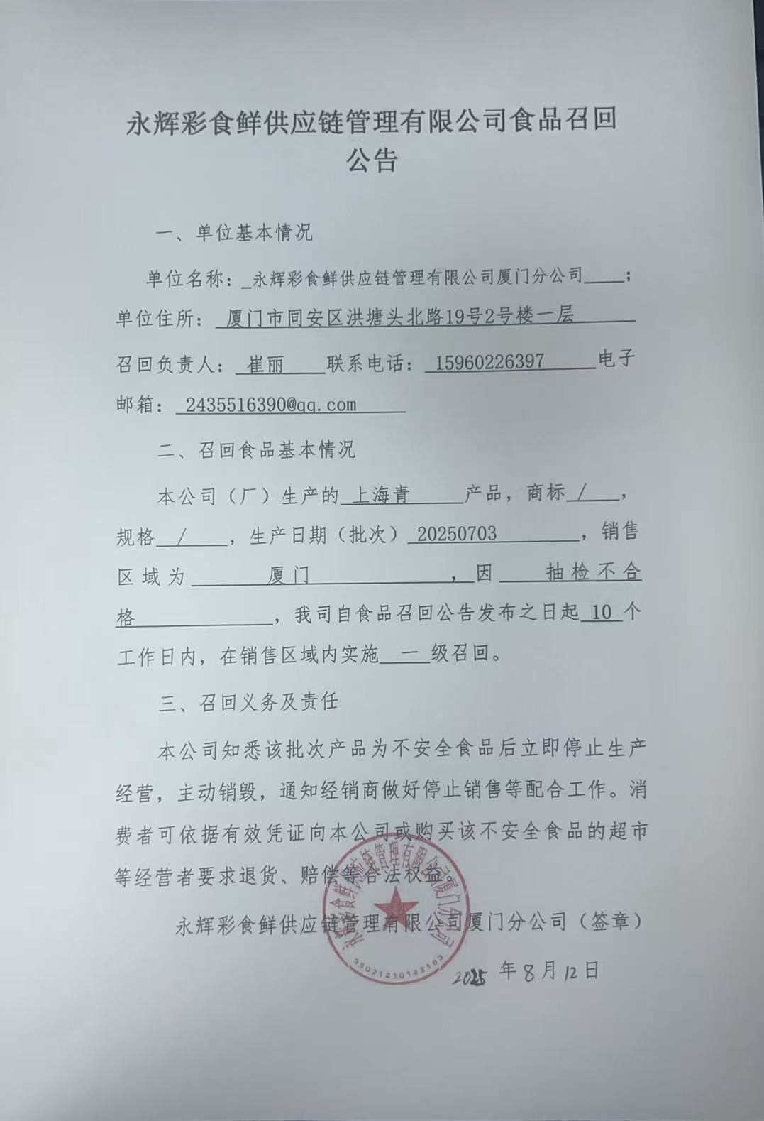 永輝彩食鮮供應(yīng)鏈管理有限公司食品召回公告(20250812)