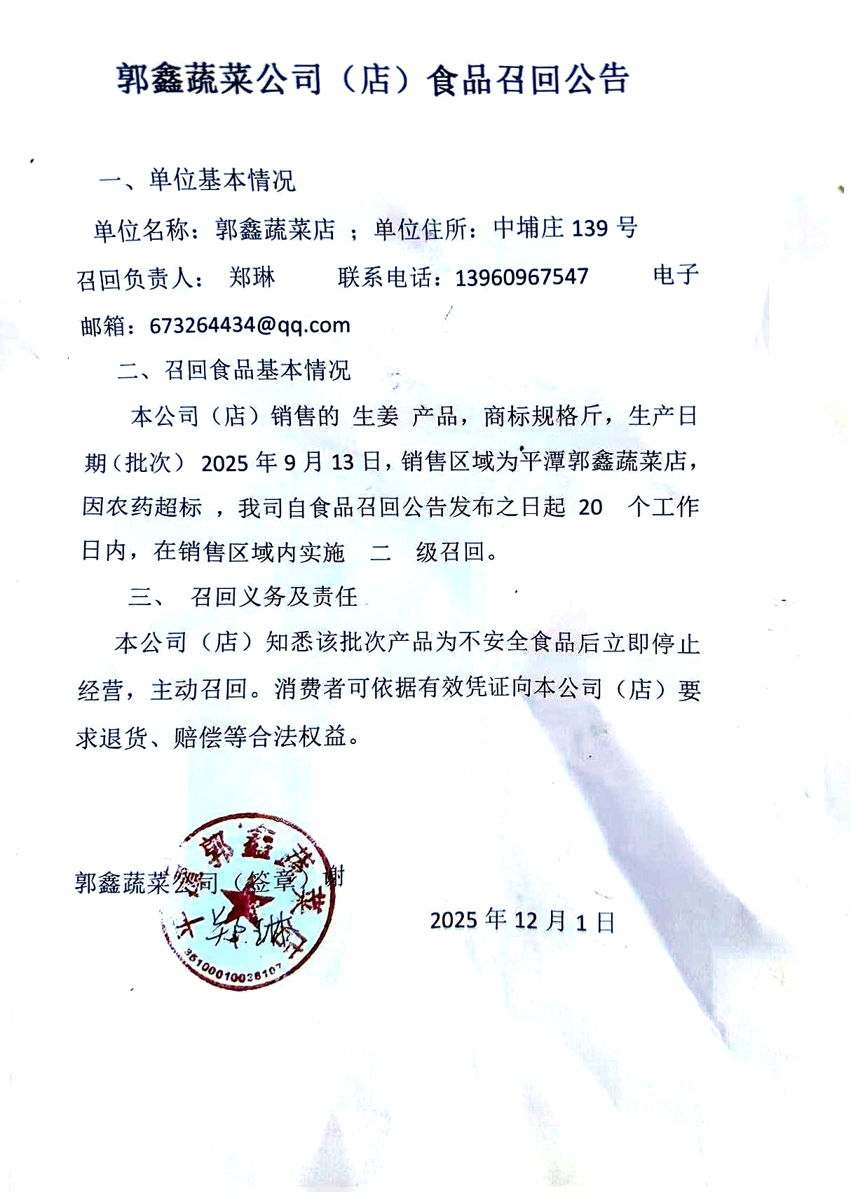 平潭郭鑫蔬菜店食品召回公告(20251201)