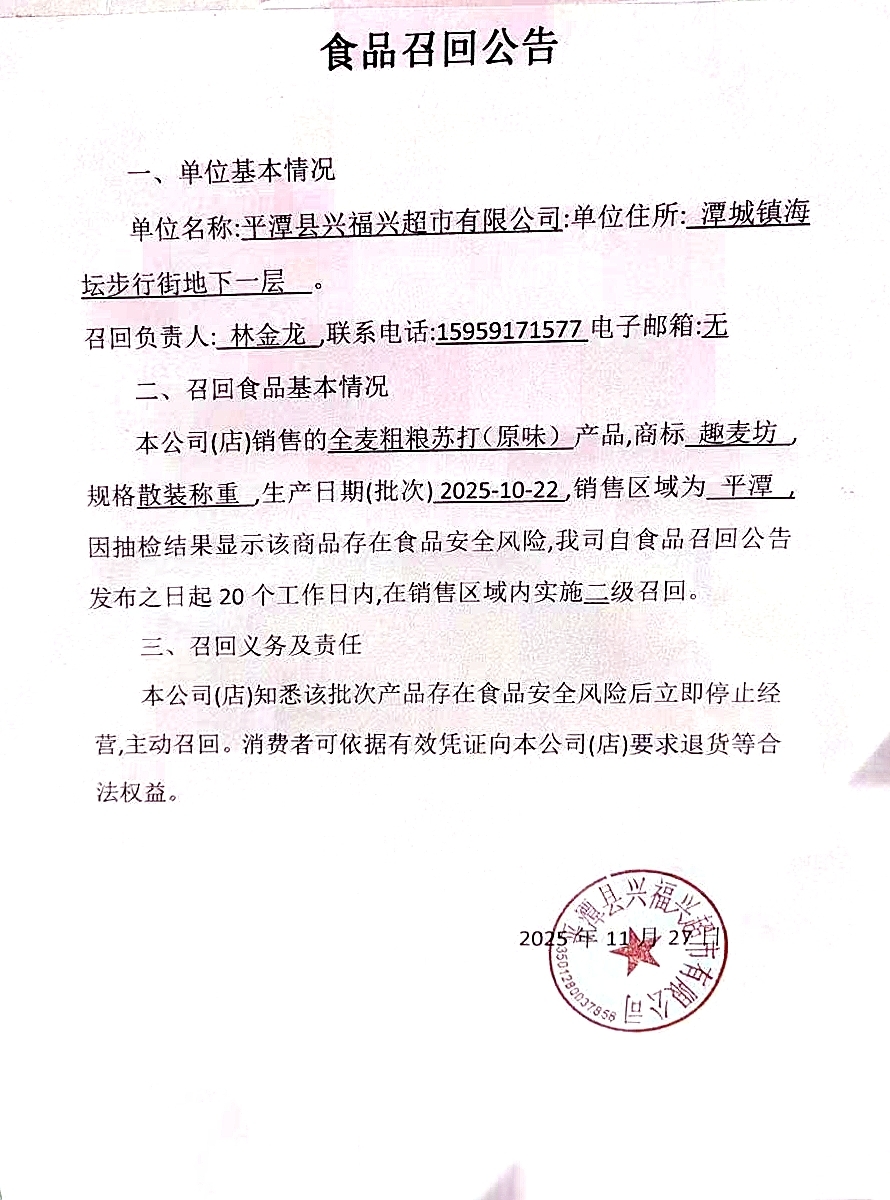 平潭縣興福興超市有限公司食品召回公告(全麥粗糧蘇打)(20251127)