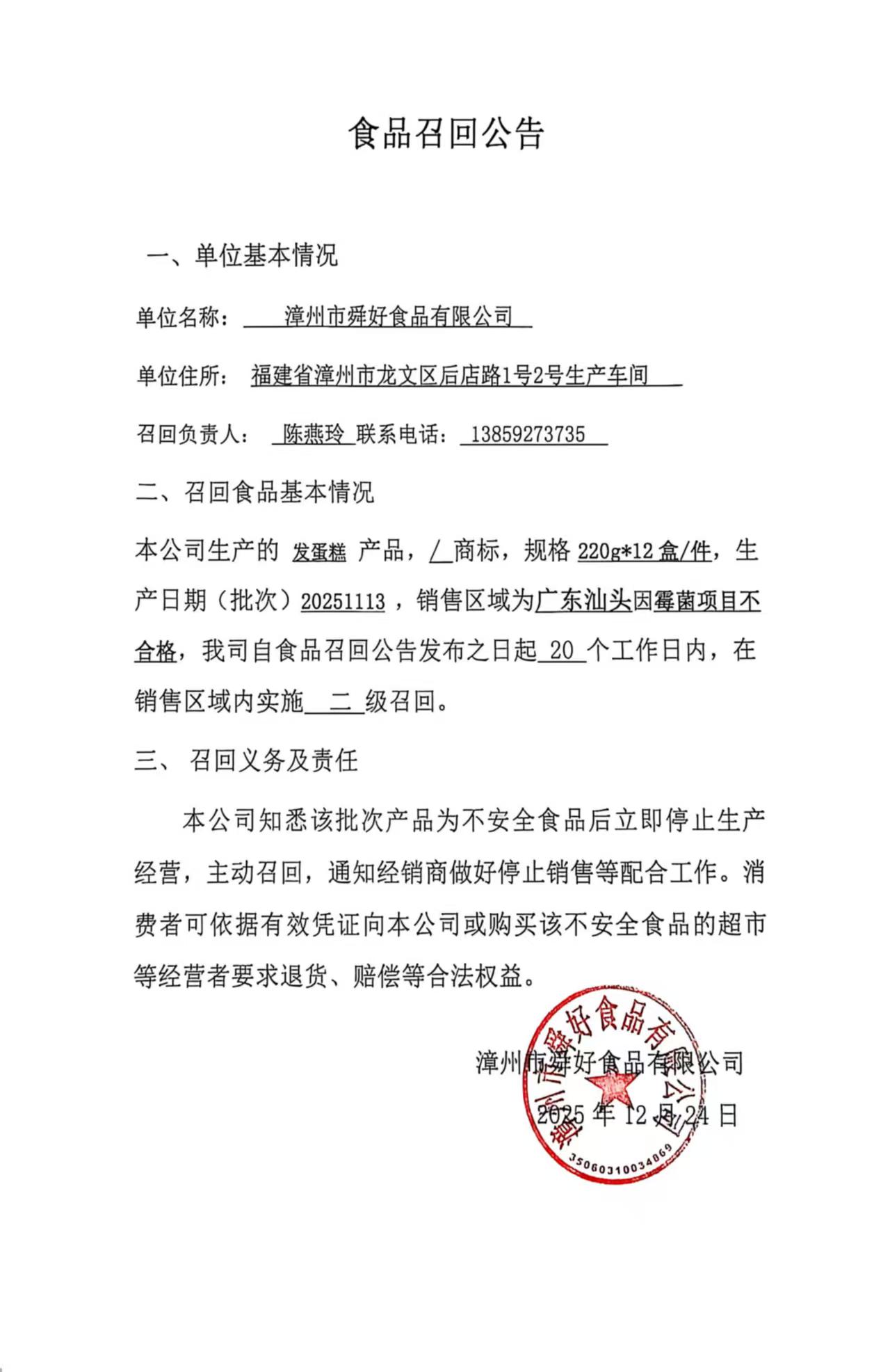 漳州市舜好食品有限公司食品召回公告(20251224)