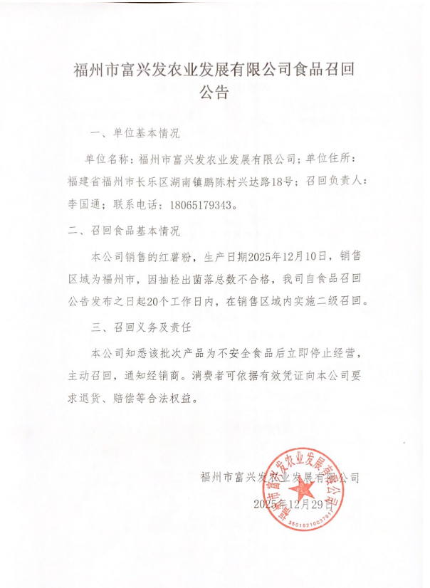 福州市富興發農業發展有限公司食品召回公告(20251229)