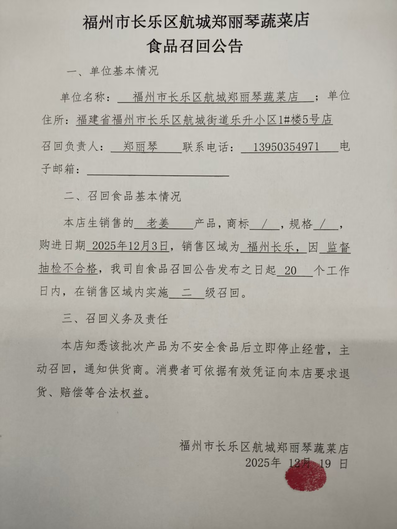 福州市長樂區(qū)航城鄭麗琴蔬菜店食品召回公告(20251219)