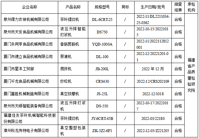 福建省食品機(jī)械產(chǎn)品質(zhì)量省級(jí)監(jiān)督抽查結(jié)果(合格)