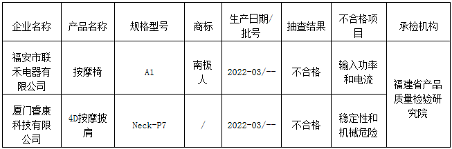 近期,依據《中華人民共和國產品質量法》和相關產品標準及抽查細則明確項目,福建省市場監督管理局組織對生產企業按摩器具產品質量開展省級監督抽查。本次共抽查30批次,其中2批次不合格,不合格發現率為6.7%。